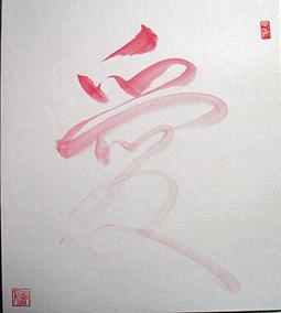 *:. 「愛唄」 2007.7 .:*おはようございます。この作品はおとなのアート・デビュー作です。「一期一会」をたまたま「おとなのアート内にあった『エンジェルアート』」のほうに送ってみたところ、おとなのアートスタッフからお声がかかりアーティスト登録をして、デビューを果たしたのです。(*^^*)この作品は、GReeeeNの「愛唄」をイメージして書きました。*: B67 神聖なる愛 :*オーラソーマに少しハマっていることもあり、この時に初めて色付けに使う「顔彩」で文字を書いたのです。水墨画の「引っかけ」という技法を使っています。墨で書くよりも筆が滑らかに進み、絵を描いているような感覚でした。皆さんの愛のかたちは何ですか?「書の道」はまだまだ続きます・・・・。**★** こちらのサイト様に「書」と「フラワーアレンジ」作品を載せてもらっております。*9月30にこちらのサイト様は「休止」されます。8/5 水墨画 『 今福の滝 』 (墨一色で表現しました。)