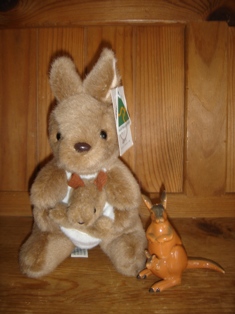 1ヶ月弱・・・オーストラリアに滞在していた父と母を夜9時過ぎに迎えに行き相当疲れているだろうと思っていましたが、大間違い「やぁ~ん来てくれたん~サンキュ~」って母。。。「あっという間やったわ~」と父。。。相変わらず飛んだ2人帰りの車中でも、出会った人の話や食べ物の話カンガルーやコアラ、カモノハシの話あといろいろを次から次から報告していました。そして。。。。。。。急に思い出したように「○~ちゃんに与えた課題ちゃんとしてくれたぁ」(この課題、我が家は庭にたくさんの木や花があって母が丹念に育てているので毎日水やりを欠かさずしろ!との命令だったのです。)毎日はできなかったけど、昨日チェックしたらどれも木々や花たちはとても元気だったので「ママいつもたいへんな庭仕事してるねんなぁ~、毎日きつかったわぁ~」とオーバーに言うと「ありがとう!!毎日じゃないと思うけどがんばってんね」だって。(見透かされてるさすが母)ホントにパワフルな2人。お土産はこれ。 designed by *ま~ぶる*毎回何が欲しいか聞かれるけど今回は特に欲しいものが見当たらず無事に帰ってきて~とだけ伝えたところ姪っ子たちと同じぬいぐるみと陶器の置物でしたカンガルーの赤ちゃんが出し入れできとても気に入っています。