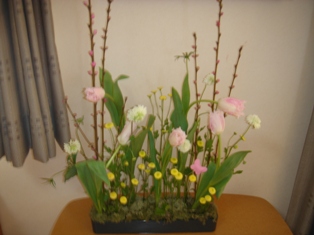 2ヶ月ぶりにお花のお稽古に雛祭りのアレンジメントです。まっすぐに生けるパラレルっていうスタイルです。なかなか簡単そうで難しい~~~~~先生のO・Kがなかなかでなかった手ごわいスタイルでした。ちゅうりっぷに春を感じました。ハウステンボスという種類のちゅうりっぷです。でも、ほんとに先生の花材選びは素敵だなぁって感心します。designed by *ま~ぶる*