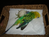 一昨日から少し調子の悪かった玄関にいるセキセイインコのポポちゃんに「おはよう~」を言いにいくと、餌箱の下にうずくまっていた。覚悟はしてたけど涙が溢れて止まらない。ポポちゃんを籠からだして一生懸命にさすったけどとても苦しそうな息。7年前に2階のテラスにちょんと止まっていて母が「おいで」と手を出すと手のひらに自分からのってきた。母はしばらく自然のままが良いのか、それとも我が家に飛んできてくれたんだから飼おうか迷ったらしいが、とにかく愛らしい声で手のひらで鳴くのでその時から我が家に舞い込んだ幸福の鳥として大切にみんなで育ててきた。すぐに我が家に慣れて、「握手」と言うと片足を指に持ってくるようになり暑い夏の日には、ホースのままの水を自分から浴びにくる元気なこで「おはよ!」と言うと必ず綺麗な声で「ぴよ!」って答えた。寒い日も暑い日も日光浴がスキで外に出るとすずめたちとなにやらおしゃべりしていた。鏡も大好きでよくかがみの前で歌っていましたね。みんなが2・3日の旅行にいってもちゃんとお留守番してくれていた。みんなの「いってきます」「ただいま~」を一番に聞いて答えてくれていた。2年前からはワンとの共同生活になって自由に飛べる時間が減って。。。ごめんね。ぽぽちゃん。私の勝手で自由が減ったね。それでもいつも同じように見つめてくれていたね。天国に召される時も私がお休みの時にしてくれて。。。 母が「私の手に来てくれたから 見送る時も私の手の中で」とそっとわたしからポポちゃんを受け取って「泣かないの。」と私に言いながら、母の目も涙で溢れそうになっていた。手の中で1時間くらいでポポちゃんはとても安らかに天国に召されました。母がぽつりと「ポポちゃんありがとうね。ポポちゃんが家に飛んできてくれた意味はじゅうぶんにあったよ。」と言っていました。出会いがあると必ず別れがありますがどのわかれも辛いです。ほんとに辛いです。お庭の薔薇と勿忘草を摘んで、そばにおきました。そのあと、おとなりのおばさんもたくさんのお花を持ってきてくれおわかれをしました。ありがとうポポちゃん。