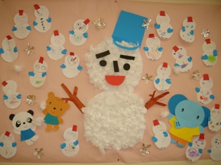 2月の壁面は予定通りに雪だるまにしたけど・・・・・・どうも降りそうにありませんね。製作の導入としてトラックで運んできた雪では遊んだけれど。雪が降っている様子を体感させてもないし。。。でも予定通り 雪だるまを作りました。 *ま~ぶる*
