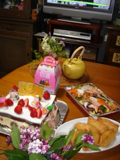 ちらし寿司を母と作り、おばあちゃんの所に持っていく前にこのケーキ カイザー のケーキ生地が細かくて、中には苺がごろごろ、クリームはラム酒の利いたカスタードクリーム 本当にここのケーキはどれを食べても美味しいです。 行くことを前持って言っていたのでスーパーおばあちゃんは、よそ行きスタイルでお化粧ばっちりで写真を撮る用意をして待っていました。母と私は普段着も普段着でも並んで「私たちなんだかとても違和感あるね。」と母・・・そうしたら、おばあちゃん「私が綺麗に写っていいねん」とピースしていました。相変わらず可愛いおばあちゃんとても楽しいひとときが過ごせたようでよかったです。