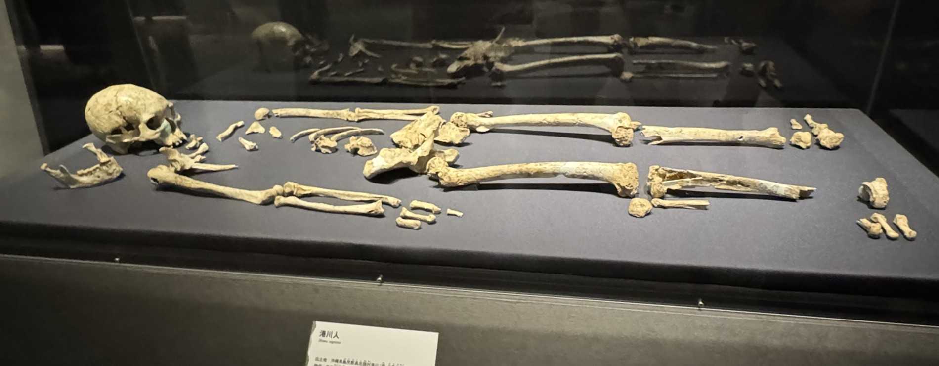 日本旧石器時代のパラドックスは、前回でも述べたように古本州島と北海道半島では旧石器は1万カ所以上で出土しているのに人骨は浜北人部分骨のみなのに、琉球列島では旧石器人骨は多くの個所(部分骨だけを含めればたぶん10カ所以上)で見つかっているのに旧石器の出土はほとんど無いことだ。 これは、琉球列島が主に石灰岩で覆われていることに由来する。石灰岩地帯では骨は溶かされることなく石灰岩に包まれて残存しやすい。しかし旧石器人は石器原材を入手できなかった。石灰岩は脆くて石器になり得ないのだ。◎港川人など旧石器人骨が続々と見つかる、世界最古の貝製釣り針も その琉球列島で初めて見つかった旧石器人全身骨格が、港川1号(写真=男性)だ。他に女性人骨3体も見つかった。ちなみに港川1号は、東アジアでも唯一とも言える完全な旧石器人全身骨格だ。 その後、サキタリ洞窟や石垣島の白保竿根田原洞窟でも旧石器人骨が続々と見つかり、琉球列島は旧石器人骨の「展示場」のようになった。 「氷河期展」では、サキタリ洞窟の旧石器人骨は左下顎大臼歯(写真)しか展示されていなかった。まだ研究中だからだろう。また白保竿根田原洞窟でも全身骨格が出土しているが、同じ理由か、展示はなかった。 なお冒頭でも述べたように琉球列島には、例外的な存在以外、まず旧石器は見つからない。その代わり、旧石器人は豊富な貝殻を加工して貝器を作った。 サキタリ洞窟では、貝で作った釣り針が見つかっている(写真)。年代は2万3000年前頃で、世界最古の釣り針とされる。◎リュウキュウジカなど小型化も2万年前頃には絶滅 沖縄旧石器人の獲物になっていた哺乳動物は、リュウキュウジカ、リュウキュウムカシキョン、リュウキュウイノシシなどだ。このうちイノシシだけは、完新世になっても生き残ったが、リュキュウジカとリュウキュウムカシキョン(写真)は、いずれも旧石器時代末の2万年前頃までに絶滅した。多産のリュウキュウイノシシが絶滅を免れたことと対照的だ。おそらく狭い島嶼で、遅くとも3万数千年前には現れた人類の影響が大きかったに違いない。 写真では分かりにくいが、リュキュウジカはホンドジカと比べて一回り小さい。前期更新世ではそれほど顕著ではなかった。島嶼化と言って、狭い島に閉じ込められた大型動物は小型化するのが通例だ。◎ヒトもまた例外ではなく港川人は小柄 人類も例外ではなかった。港川人も小柄だった。4体の港川人骨の推定身長は、男性(1号)で約155センチ、女性(2~4号)は約144センチだった。 島嶼化が起こるのは、狭い島では捕食動物がいないので草食獣は大型化する必要がなく、半面、食料資源が乏しいから、できるだけ小型化する方向に進化するのが合理的だからだ。生まれた仔のうち成長して大きくなった個体は食料不足で死ぬ(その遺伝子も次に伝えられない)が、その一方、身体の小さい個体は繁殖年齢まで生き、その遺伝子は次世代に伝えられる。こうした選択が続けば、島の動物群は小さくなっていくのだ。◎氷期末に草創期土器が出現 こうして1万1700年前に、全地球的に氷期が終わり、温暖な後氷期になっていく。 その直前に、古本州島に1つの技術革新が起こった。土器の誕生である。 神奈川県月見野遺跡群上野遺跡で発見された隆起線文土器が展示されていた(写真)。年代は、約1万5000年~1万3000年前で、縄文時代草創期に当たる。 氷期末に現れた土器文化は、やがて古本州島と北海道半島に伝わり、縄文文化が開花するのである。(完)昨年の今日の日記:「イスラエル、ハマスの最高指導者で最強硬派のシンワール殺害、ガザ戦争の終わりに希望の灯」https://plaza.rakuten.co.jp/libpubli2/diary/202410190000/