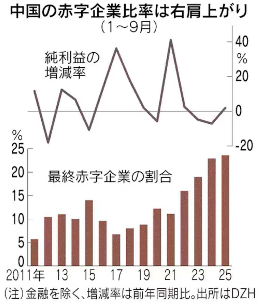 悪性デフレに突入しつつあるスターリニスト中国の経済は、かなり重症かもしれない。◎原因は不動産不況と過剰生産 9月期四半期決算が出揃ってみると、上場約5300社の2025年1月~9月期決算は、最終赤字となった企業の割合が24%、実に4分の1にも達した(図)。 データの取れる02年以降では最低だという。 日本なら、スタートアップ企業なら経常赤字は普通だが、東証プライム、スタンダード市場上場で赤字決算企業など、今はほとんどない。かつては酷い時もあったが、市場上場の4分の1が赤字だったことなど記憶に無い。 むろん原因は、はっきりしている。不動産不況と過剰生産だ。◎上場不動産会社の約半数は赤字 不動産不況は、底無しだ。20年に習近平指導部が銀行に融資規制を打ち出して以来、改善の気配も見えない。少子化・人口減・婚姻数減もあって、売れ残り物件が積み上がっており、業績悪化に歯止めがかからない。 いかに酷いかは、1月~9月期の上場100社中、半数に近い48社が最終赤字だった。新築住宅の販売面積が1月~9月期に前年同期比6%減となったから、無理も無い。不動産各社は、少しでも在庫整理をと投げ売りに走っているから、赤字企業は拡大・広がっている。◎マンションブランド企業も1月~9月期で6100億円もの大赤字 中でも、かつてはスターリニスト中国マンション業界トップで品質評価の高い物件を提供する優良ブランド企業だった万科企業(写真)は、1月~9月期の最終損益が280億元(約6100億円)と、スターリニスト中国上場企業の中で最悪の赤字額を出した。スターリニスト中国の不動産の破綻と言えば、恒大集団や碧桂園があるが、当初は比較的安全と思われていた万科企業が破綻に瀕している。 26日には、近く満期を迎える債券について償還期限の延長に関する債権者集会を開催すると公表し、債券価格と株価が急落している。例えば社債は約50%も急落した。社債保有者は、デフォルト必至とみているのだ。 不動産デベロッパーが軒並み不振となれば、運命共同体とも言える建設業も大不振で、建設業の3割超が最終赤字となっている。◎太陽光発電も自動車も デフレ不況が深刻化すると、他の業界にも波及している。特にスターリニスト中国の宿痾とも言うべき過剰生産だ。 典型が太陽光関連の企業群で、晶科能源(ジンコソーラー:写真=同社製の太陽光発電パネル)を初め大手各社が軒並み最終赤字となった。過剰生産で需要を上回る太陽光発電パネルを市場に垂れ流しにしているのだから、赤字になるのも無理はない。 価格競争に巻き込まれている自動車も酷い。乗用車、商用車のメーカー21社中6社が最終赤字となり、純利益合計は10%も減益となった。国有の広州汽車集団が43億元の最終赤字となった他、「中国のテスラ」と言われるEVの比亜迪(BYD)も、黒字を維持するも8%の最終減益となった。◎溢れた製品は海外へダンピング輸出 不動産も太陽光発電パネルも、そして自動車も、みんな作り過ぎである。自動車はなお需要が伸びているが、それも鈍化している。そして奴らのとる最終手段は、かつての鉄鋼業界がやったように、海外へのダンピング輸出である。 スターリニスト中国の太陽光発電パネルの安値輸出のあおりで、かつては世界市場に君臨した日本の太陽光発電パネルメーカーは、ほぼ無くなった。自動車も、日本メーカーの金城湯池だった東南アジアで、少しずつシェアを減らしている。 比亜迪のEVも同様で、日本では車種によっては100万円以上の値引きで安値攻勢をかけている。経産省が今のうちにダンピング輸出を規制しないと、日本のEVは駆逐されてしまうかもしれない。昨年の今日の日記:「ウクライナ戦線に投入された北朝鮮傭兵は幸せか、自由の道への扉が開かれた」https://plaza.rakuten.co.jp/libpubli2/diary/202412020000/