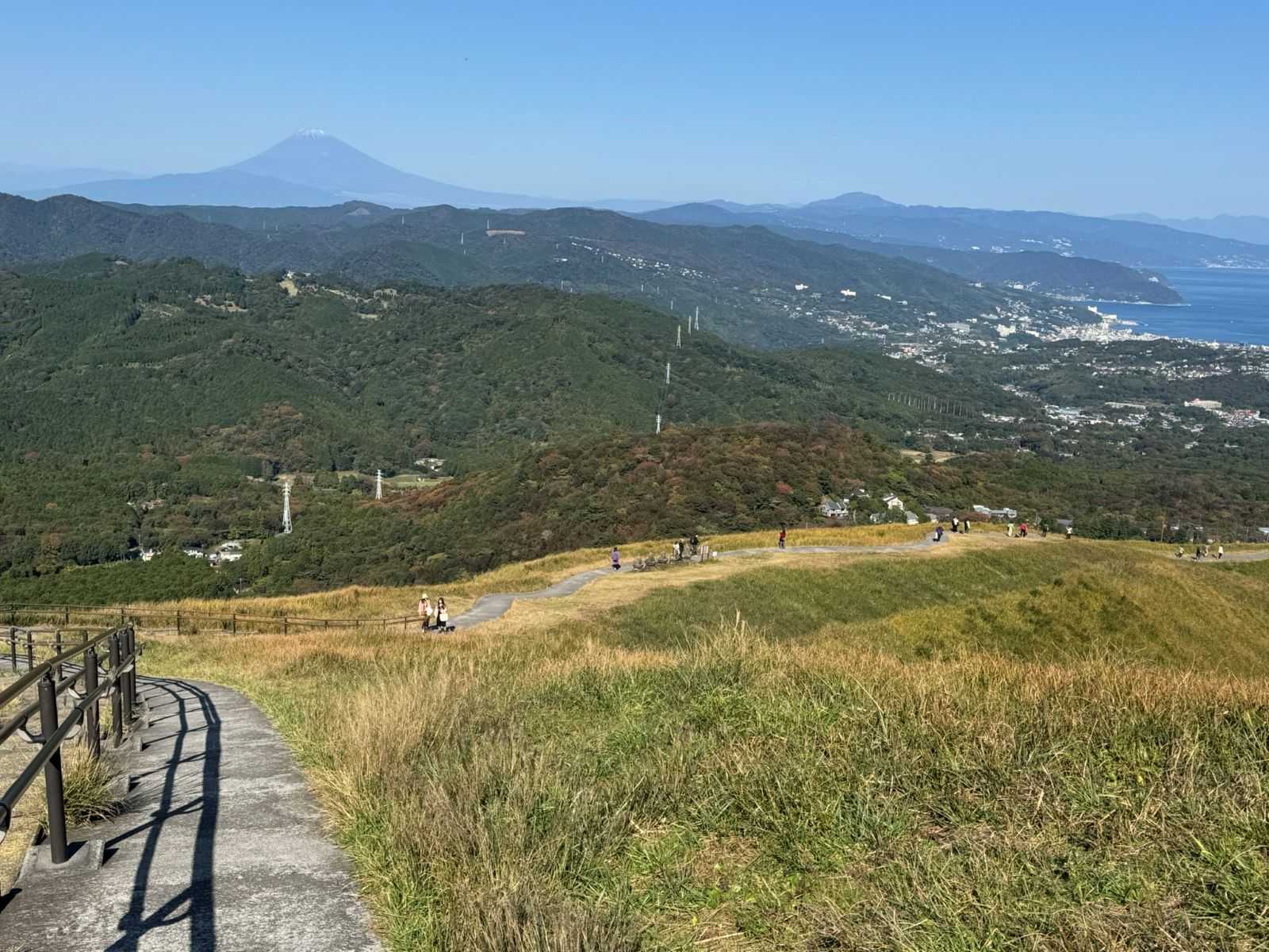伊豆高原に行った。某温泉旅館に泊まり、翌日、大室山に行った。◎1周1キロの外輪山散歩「お鉢めぐり」 大室山は2度目だ(15年6月15日付日記:「曇天、霞の伊豆高原の大室山に『登る』;レジャー、植物学、火山学」https://plaza.rakuten.co.jp/libpubli2/diary/201506150000/を参照)。前回は曇天だったが、今回は晩秋の好天で、山頂からの景観に期待がもてた。 大室山は標高580メートルのお椀を伏せたような美しい休火山で、登山には絶好の山のように思えるが、山体が国の天然記念物に指定されているので、残念ながら徒歩では登れない。北斜面のリフトに乗って登るしかない。約4000年前に噴火して出来た、まだ新しい山だ。 火口は直径約300メートルほど、山頂の外輪山は、1周約1キロで、「お鉢めぐり」とされる散策路となっている。少々の雨の日でも滑らないように、舗装がされている。ただ、外輪山もけっこうアップダウンがあり、足回りはしっかりしていた方がいい(写真)。 行程7~8分ほどのリフトで登ると、お土産屋やお休みどころ、トイレなどの施設が整備されている。時計回りでも反時計回りでもどちら回りでもいいが、僕は時計回りを選んだ。◎北に富士山、南に大島などの伊豆諸島遠望 伊豆半島の東に聳える独立峰だけに、歩くたびに遮るものの無い景観が開ける。 白いキャップをかぶったように9合目辺りまでわずかに冠雪した富士山が、北に望める(下の写真の上)。そして右に目をやると、青い海に縁取られた伊東市街が望める(下の写真の下)。 比高40メートルはありそうな火口を見下ろすと、美しい芝生はアーチェリー場になっている(写真)。 快晴だが、前日に雨が降ったわけではないので、わずかに霞んでいるのが残念に感じたのは、南の伊豆諸島を望んだ時だ。大島は、すぐ近くに見えたが、市街地は見えない(下の写真の上)。その右、すなわち南には、利島、新島、神津島が望める(下の写真の下)。 そしてそのやや左にはうっすらと房総半島が横たわっている。しかしむろん街などは全く視認できない。 神津島については、以前に本日記に、3.8万年前の旧石器人が黒潮分流を突破して黒曜石を採取しに行ったことを述べたことがある(24年11月20日付日記:「旧石器時代初期から始まった日本人の優れた進取性」https://plaza.rakuten.co.jp/libpubli2/diary/202411200000/を参照)。1度そこに良質の石器原材があると分かれば、神津島は伊豆から視認できるので丸木舟を操って採りに行けたのだろう。 季節は晩秋だから、ワイルドフラワーは見られなかった。◎お鉢めぐり、2回 お鉢めぐりは、2回、行った。最初は、約35分かけ、写真を撮りながらゆっくりと。1周終わって時間があったし、やや物足りなさが残ったから2度目は、ハイキング感覚で約20分。 外輪山1周の行程は約1キロだが、アップダウンがあるのでハイキングでも20分はかかるのだ。 山体は、全周にカヤが生えている。春に野焼きして、カヤの更新を図っている。昔は、ここから住民たちが屋根その他の生活材料を調達するために雑木が生えないように行っていたらしいが、今では観光用に美しい山容を維持するためにしているにしている。また早春の野焼き行事は、絶好の観光資源にもなっている。 晩秋の良いハイキングだった。昨年の今日の日記:「スターリニスト中国、習近平、いよいよ沖縄奪取に動き出したか」https://plaza.rakuten.co.jp/libpubli2/diary/202411100000/