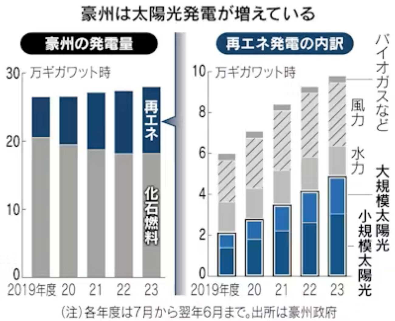 再生可能エネルギーバブルも、ここまで来たか。 オーストラリアは、来年7月から昼間の最低3時間、電気料金を無料にすることを電力会社に義務づける。◎普及し過ぎた太陽光発電 太陽光発電と風力発電の急ピッチの普及で、同国では2024年に発電量に占める再エネの割合が36%に達した(図)。今年末までには5割近くに達する模様だ。 再エネの約7割は、安価な中国製パネルを屋根に敷き詰めた太陽光パネルによる太陽光発電で、人口2700万人の国内で400万以上の世帯がパネルを設置している(下の写真の上と中央=屋根に敷き詰められた太陽光パネル)。土地が安価だから、広大な荒地にソーラーパネルを敷き詰めたメガソーラーも多い(下の写真の下)。 オーストラリアは、年間を通じて晴天の日が多い。しかも土地は広大で、太陽光発電にうってつけだ。 ただ太陽光発電は、昼間に発電する。夜間は発電できないのに、家庭の電力需要はむしろ夜の方が多い。ここに、大きな需給ギャップが生まれる。◎電力卸売市場では「マイナス価格」も あまりに太陽光発電量が多くなると、電力系統に負荷がかかり、大規模停電の原因となる。だから日本でも、九州など西日本では、昼間の太陽光発電の出力抑制をしている。 大きくなりすぎた昼間と夜間の需給ギャップのために、再エネ発電を一時的に止める措置がとられているが、すでに電力卸売市場では、発電事業者が小売り事業者や大規模需要家にお金を支払って引き取ってもらう「マイナス価格」も生まれている。 オーストラリアでは、午前9時から午後2時の間に電力卸売価格が0ドルを下回るマイナス価格になる割合が30%を超えている。すでに一部の州では、家庭に無料にするプランを始めている電力会社もある。◎先進国のヨーロッパで増える電力マイナス価格の発生時間 かくして全国的に昼間の3時間の電気料金をタダにして、消費者に日中に洗濯機やテレビなど家電を使ってもらったり、EVを充電してもらったりするように消費を促す。昼間の使用を把握するために、無線通信機能を持つスマートメーターを付けた家庭が対象になる。 太陽光発電を主にした再エネ発電の盛行は、先進地のヨーロッパでも問題化している。フランスの電力卸売市場でマイナス価格が発生した時間は24年1月~6月の半年間で計205時間にもなった。ドイツも同時期に224時間と、前年同期の3倍にもなった。アメリカでも先進地のカリフォルニア州では、全時間の4分の1も占めた。 オーストラリアが来年始める昼間の電気料金無料化は、今後も再エネ発電が拡大していけば先進国中心に拡大していくだろう。 世界的にも割高な電気料金を払わされている日本では羨ましい話だ。昨年の今日の日記:「厳冬の上高地でも魚狩り行動などで生きる逞しいニホンザルたち」https://plaza.rakuten.co.jp/libpubli2/diary/202411240000/