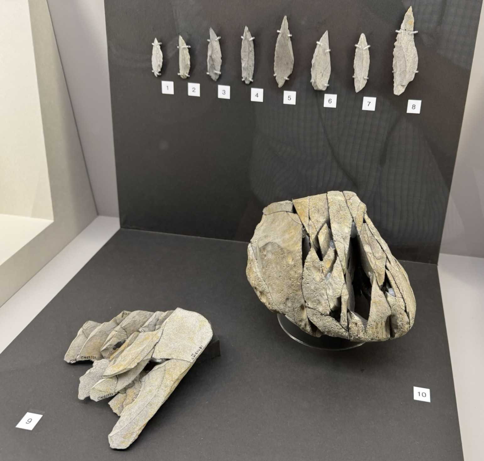 日本の旧石器遺跡で特徴的なのは、出土遺物が異常に石器に偏っていることだ。北海道も含めて列島で検出されている旧石器遺跡数は1万カ所を超えるが、その99.9%は石器だけが出土した遺跡だ。◎石器製作過程を復元する石器接合 火山列島である日本列島は全土に火山灰が積もり、したがって土壌は酸性土となる。骨は容易に溶けてしまい、残らない。江戸時代の人骨すら、特殊な状況でなければ残らない。 したがって日本の旧石器研究といえば、石器を対象にするしかないが、その代わり世界でも異例に石器研究は進んでいる。 例えば、旧石器人が原石を割って石器を製作した過程を跡づける「接合」例は日本の旧石器研究の精緻さを物語る一例だ。石刃技法で石刃を剥離していったものを石屑まで集めてジグソーパズルよろしく復元するのだ(写真=大阪、翠鳥園遺跡の瀬戸内技法による石器製作過程を復元したもの)。これによって石器製作過程がよく分かる。◎資源節約型の爪楊枝大の細石刃 また火山列島だけに、石器原材には恵まれている。とびきりの原材は、火山ガラスである黒曜石だ。ガラスだから、割れば鋭利な刃が得られる。 出土地は失念したが、黒曜石製の細石核と細石刃の展示がある(写真)。おそらく年代は、氷期末の1万5000年前頃だろう。 下段中央の爪楊枝のような石器が細石刃である。上段右が細石刃を打ち欠いていく細石核と細石核の加撃点を作るために打ち剥がした船底形剥片だ。細石刃はそれだけでは小さすぎるから骨や木、鹿角に植え込んで槍先を作った。細石刃は小さいだけに、少量の石材から大量に製作できた。つまり資源節約型の石器製作技術である。◎黒潮を超えて外洋の神津島に黒曜石採取して戻る そして古本州島最古の石器と考えられるのが、静岡県井出丸山遺跡の石器群だ(写真)。3万8000年前である。 4と5の番号の振られた黒い色の石器が黒曜石製だ。ただしこれは、伊豆諸島の神津島産だ。神津島は今まで1度たりとも古本州島と陸続きになったことはない。しかも神津島の北には黒潮の分流が流れている。重要なのは、3万8000年前の旧石器人は黒潮を乗り切って神津島に渡ってきて、そこで黒曜石を採取し、さらに古本州島に戻ったことだ。 古本州島のホモ・サピエンスの進取性と冒険心がすごい(24年11月20日付日記:「旧石器時代初期から始まった日本人の優れた進取性」https://plaza.rakuten.co.jp/libpubli2/diary/202411200000/を参照)。◎未来への予見性を示す「落とし穴」遺構 古本州島の旧石器人の先進性を示すものとして、もう1つ重要な遺構に「落とし穴」がある(写真)。写真パネルだけだったが、神奈川県船久保遺跡の例が展示されていた。 普通なら気にも留めないかもしれないが、考えようによっては、ホモ・サピエンスの先見性を示すすごい遺構かもしれないのだ。 狩猟と違って、必ず獲物が獲れるかどうか分からない。しかし原野の獣道に1列の穴を掘っておけば、ひょっとすると動物が落ち込み、捕獲できるかもしれない、と旧石器人は考えたのだ。ヨーロッパでは例はなく(ひょっとすると発掘調査でも気づかれていないのかしれない)、東アジアでも知られていない。古本州島の旧石器人だけが考えついたものなのかもしれない。昨年の今日の日記:「ノーベル平和賞に日本被団協、しかし日米などには厳しく、北朝鮮、中国、ロシアのならず者国家にはなぜ優しいのか」https://plaza.rakuten.co.jp/libpubli2/diary/202410170000/