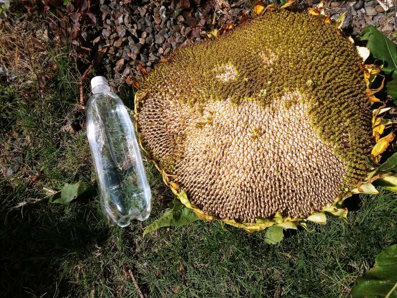 以前アップした、3m越えのひまわり。 完全にお辞儀したので、種を収穫。 隣の1Lペット…