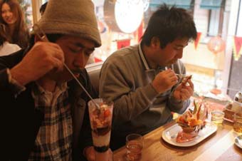 さあ!今日も、前向きにいってみましょう! 昨日のパフェ侍のネタがコトの他好評だったモンだから、今日は調子こいて、少々、加筆しちゃおうかな‥と思います。肝心な前向き野郎の姿がドコにも写ってない‥ってえのもナンですので、↑(自分を撮るの忘れてた‥)シンデレラじょーじ がmixiで出してた写真をチト拝借してきました。ソレがコレ↓寡黙なまでにパフェをむさぼるシンデレラじょーじ(窓際)と、前向き野郎(手前)。。おやぢのシブさを辺り一面に漂わせながら、黙々とグラスに向かうサムライ二人。。昨日も書いたけど、コレ、発起人のT・斉藤さんの企画であって、本来は「男パフェ」というンだけども、ナンでこんな企画考えたのだろうか‥と、お思いの方も一人ぐらいいるだろうから、チョボっとだけ説明すると、T・斉藤さんが記事を書いてる、デイリーポータルZに、長崎にはいろんなモンがあるというコトを巨大パフェを例にとって載っけるタメ‥。。だから、このパフェ代も全部、T・斉藤さんが出してくださった。ホントにごちそう様でした。と、そう言ってしまうと、なんだか、ヤラセっぽい気がしなくもないが、取材半分、好奇心半分の企画であったタメ、巨大パフェを食べてる途中で本人、取材であるコトを忘れてしまっておった。ソファーに正座して、スプーンを正眼にかまえ、すくいとったパフェを食べ、また皿に戻すまでの作法を、ああでもない こうでない‥と考え込み始めた。つられて神崎隊長、シンデレラじょーじ、前向き野郎の三人も、いや、この方がよろしかろう‥いや、それだと動きが止まるでござる‥では、コレなどは如何でござろう‥などと思案し始めたモンだから、ハタから見てたら、まるでチャンバラごっこをやってるガキんちょの集団である。写真にもチラっと写っておるけど、後ろの席で2組のカップルが呆れて見ておったし‥。で、この2組のカップルが所望したのが、T・斉藤さんの70センチパフェをはるかに越える、期間限定、超巨大パフェ、“トリノ”っつうヤツ。。もちろん、冬季オリンピックにひっかけたメニューなんだけど、コレが、チーズケーキが加わった分だけ高い、75センチ!。。↑この情報は、後ろの席にいたカップルのうちの、モデルさんかと思うほどのスッゲェべっぴんさんがワザワザ教えてくれた。カップル同士で和気あいあい。。ナンとも、うらやましい限りでござる‥と思いながら ふり返ると、T・斉藤さんと神崎隊長が、真剣な眼差しで、トリノの乗ったテーブルの方に、ツカツカと歩み寄って行くので、お!こりゃ一戦交えるつもりでは‥と固唾を呑んで見守っておると、すいませ~ん、ソレ、写真撮らせてくださぁ~い♪・・・・。ナンとも、あっぱれ!何度でも言うが、パフェ侍に怖いモンは無い。。そして、「男パフェ」に流儀はいらない。メニューにビビっときたら、速攻オーダー!脂汗がニジんでも、サムライの意地にかけ、クチいっぱいに頬張って、ただひたすらに、食すのみ‥。 二日に渡って「パフェ」の話しを書いたので、チト食傷気味の前向き野郎。明日からしばらく、いつもの粗食に戻すコトにします‥。ってなワケで、今日はここまで。。ま、サクっ!といきましょっ さあ!今日も、前向きにまいりましょう! 《終》