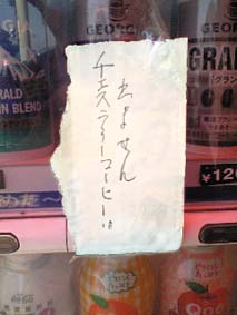 さあ!今日も、前向きにいってみましょう! 昨夜の晩ゴハン、オカズが塩鮭であった。大喜びして早速かぶりついたらば、塩鮭なハズなのに、ナゼかしょっぱくない。とうとう味覚をやられたかな‥と不安になったので、ダイコンの漬物をチョイとかじってみたら、辛い‥・・。。どうやら味覚障害ではなさそう。ではナゼに、塩鮭がしょっぱくないのか‥全体的に減塩傾向にあるせいだろうか。しかし、塩鮭がしょっぱくなかったら、ナンなのだろう。ただの焼き鮭じゃないさ。仕方ないから、お醤油をかけて食べてみた。と、コレが、意外にオイシかったので、コレから鮭の時は、お醤油かけてから食べるコトにしよう。で、そのコトを今朝、オッカサンに自慢して話したらば、オッカサンも昨晩、醤油かけて食ったらしい。。そんで、お醤油をかけてしばらく放置しておくと、更にオイシくなるのだとか。そんならそのように、いつもの置き手紙に書いてくれてたらイイのによ‥と言おうとしたらば、ソレぐらい常識やっかねふふん‥と先越されて言われ、オマケにハナで笑われた。鮭は、お醤油をかけて、しばらくたってから食べるのが、常識だったとは‥。。またひとつ、勉強になったな。そんな謙虚なココロで仕事場に出てきた、今朝の前向き野郎なのであったが、フっと、バス停近くの自販機をナニ気に見やったらば、ナニやら張り紙がしてある。↑コレ。。出ませんチェスラィーコーヒーは・・・??ナンじゃこりゃ。。で、近くに寄って、よく見ると、某ジョー○アの、TASTY缶の上に貼ってあった。コレ、書いたヒト、もしかすっと、テイスティコーヒーは出ませんと書きたかったのではあるまいか‥。またひとつ、勉強になっ‥っと、このバヤイは、そうは言わないな。ってなワケで、今日はココまで。。ま、サクっ!といきましょっ さあ!今日も、前向きにまいりましょう! 《終》