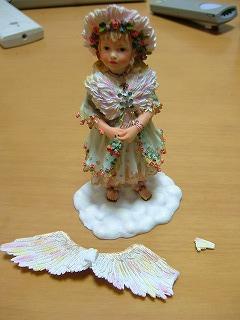 最近海外(イギリス)のオークションサイトでクリスティンハワースのフィギュアリンをポチしてます。で、つい先週も3体目のフィギュアリンが届いたのですが・・・のわーーー!!!翼が折れて届いたよ~~~でも粉々になってたわけではなく翼の先は折れてるけど、あとは背中からぱっくり取れた感じだったので売主さんには壊れていたこと、返事が欲しいことをまずは伝えて接着剤を買って直してみることにしました。接着剤はプラモやフィギュアを専門に扱っているお店の店員さんに相談して↑こちらを購入。お店の人いわく、レジンはツルツルした素材だからくっつきにくいかもしれない。と。なのでドキドキしながらくっつけてみたのですが・・・くっついたーーー硬化を待っている間に売主さんからメールが来て、返品してもらえればすぐに返金すると言われたのですが、接着剤で直したこと、壊れた原因の1つに、梱包が甘かったと思われること、そして今回は返品しないので今後、そちらで買うときにはもっと梱包に気をつけてほしいと伝えたところ他の国に送ったのも、日本に送ったのもいままでの梱包で壊れたことがなかったからもしかしたら税関があけたのかもしれない、ただ、今回は返金しますとの返事。なので直ったから今回はこのままでOK。きちんと誠実に対応してくれたので悪い評価もつけないし今後もあなたのところで買います。今回も返金はいいですって返信したのですが・・・なんと、返事を送るか送らないかのうちにもう返金されてるーーー!!!しかも、商品は送り返さないでいいですよと言ってくれました。うーん。めちゃくちゃいい人だー!!!いい人すぎる~~!イギリス人、万歳!!!でもでも。それではあまりにも申し訳ないのでその申し出にお礼を伝えて、もし必要ならば、すぐにまた返金されたお金を送金しますって伝えました。で、その返事は・・・気にしないでいいよ!つぎにまた天使や妖精を出品するときはお知らせしますね!だって~~~売主さん、天使はあなたです!!!海外オークションって、始めたばかりの時はドキドキだったけどこうして海外の人と知り合えてしかも海外とのやりとりに対する偏見がなくなり世界中にはいい人がいっぱいいるっていうのが実感できたのは本当にいい経験です。しかも、生まれて初めて学校英語ではないコニュニケーションツールとしての英語を使うきっかけにもなったしwwたしかに文化の違いからくるトラブルや詐欺まがいの被害もあると思うし、自己責任が国内のオークションサイトを利用するとき以上に問われるのでいろいろと注意が必要ではあるけれど。少なくとも、今のところ私にとっては世界を広げるためのいい刺激になっています♪ではでは、直った天使さんのお披露目ーーー!!!彼女は「無垢・純潔(purity)]」の名前がつけられた天使ですうふふふふふふふ。大満足です