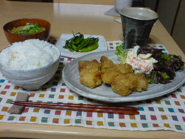 今夜も一人、料理よりも器にうっとり、ご機嫌でご飯しました。メニューは白いご飯に野菜一杯お味噌汁、ししとう焼いてポン酢かけ、ポテトサラダ、鳥のタッタ揚げ