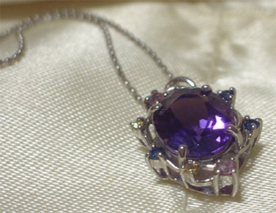 K10に濃い綺麗な紫のアメシストがついていて、周りに小さく付いているのはブルー・ピンク・オレンジのサファイアなのだそうです♪まるで花束のようなペンダント~♪とうんと気にいっています(^^*)♪