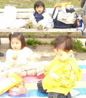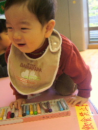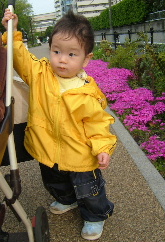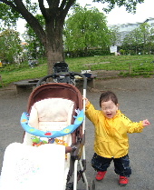 今日も午前中はリトミックいろいろ見学した結果 トライアングル♪のクラスに入りました 今日はちょっとぐずり気味 お絵かきは ぺろぺろキャンディー・・・に見えるかな? お昼は公園でお弁当を食べて 早速活動開始! 無事公園デビューを果たしました☆ ベビーカーを押しながら必死に歩きます いち に いち に とかけ声にも力が入っちゃう! 1ヶ月年上のお友達はすいすい歩いていきました~お友達のママがシャボン玉をふいてくれて うわ~と空を見上げて喜びました これも初めてだったね! 疲れてそのうちハイハイ 芝生の上で泣きじゃくり どろんこになったので帰ることに お友達から頂いた新幹線の靴カバー 初めて使ったよ♪ とっても便利! 遊歩道でおやつを食べて機嫌を直してから帰りました~