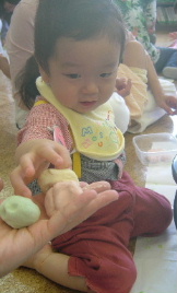 児童館でみんなで小麦粉粘土で遊びました♪小麦粉に色素(ピンク、緑、黄色)と水、油、塩を混ぜたものをコネコネ王子はお団子をぽいぽいとバケツに入れたり出したり・・・お友達は食べそうになってる~ でもママがちゃんと「だ~め」と口から持っていきました。本当にお団子のように美味しそうな小麦粉粘土♪ぞうさん を作ったママもいたよ!お友達のママが持ってきてくれた絵本をママと二人で読みました (ママは今日児童館のお当番だったの)☆どうぶつのあかちゃん 子ども達の目が真剣だった!こんなこと こんなこと でっきますよ♪ の歌遊びもしましたとっても楽しそうな王子とお友達でした。今日はお休みが多かったから子ども10人ちょっと(+ママ達)だったね。来週はここの児童館はお休みなのでリトミックに行く予定です。そして午後 前から楽しみにしていた世田谷文学館のイベント「日本の歳時記シリーズ 「歯固めの日」に親子でチューインガムを作ろう!」に参加「歯固め」とは、長寿を願って6月1日にかたいものを食べる伝統行事。まず ガムベースをこねて次に 水飴を入れてこねて更に 香料(王子はソーダ味)と色素を入れてこねて最後に 粉糖とクエン酸を入れてこねます王子もすっかり粉だらけ・・・綿棒で薄くのばして いろいろな形に型抜きしましたいちご味のガムを作ったお友達から飛行機の形のおすそわけも頂きました♪ありがとう!パパへのお土産に長方形に切ってガムの袋にも入れました♪あ~面白かったね!近くの公園でも遊びました♪ぶらんこ ゆらゆら するね~「お友達のジュースいただき~」 「何するの~!」世田谷文学館でご本も読みました☆ながい ながい☆きいろのほん☆かずのえほん いずれも五味太郎の本・・・あんまり聞いてなかったよねやりたい放題だね~もっと本読んであげたかったのにな。王子はこの日 手作りのガムをカミカミしました。まだ上4本下2本しか生えていないけど。「ぺっ」といって手を出すとちゃんとガムを口から出しました。コミュニケーションが出来るようになってきたな~