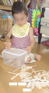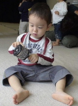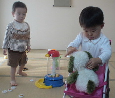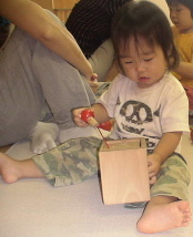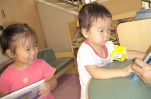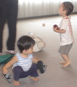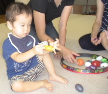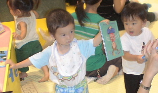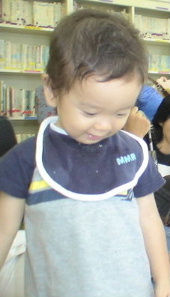 朝のデザート おじいちゃん・おばあちゃんが送ってくれた梨を食しました♪梨大好きです!(もっと送って!?)近所の児童館に行ってきました♪素麺を持ち寄り 素麺チャンプルーを食べました。 初めて食べたけど 意外と美味しくてびっくり! 何と夜も素麺チャンプルーにしました。。。足りなかった?王子はお友達のウインナーを頂き~ (勝手にごちそう様です・・・)やっぱり広いところは楽しいみたいで走り回って喜んでいました♪お友達は面白いものを見つけたみたい!影絵の道具、綺麗だし かさかさ音がするから気に入ったのね!カメラを向けるとポーズをしてくれるようになった!感激!今度会えるまで後何回遊べるかな?聴診器でぬいぐるみを診察中・・・フリスクのCMドクター編みたいだね!何か取り合っている風だったけど今日も残念だったねェ。。男子チームはお絵かき中他のお友達が帰っちゃっても3人で遊んでいました。座布団に座ってご満悦の王子です♪輪投げもかじったり・・・ そう言えば最近よくママやパパの事をかじります。 (歯形が付くことも!)家中上れるところは何処にでも上るし、棚の上に上げておいても王子の射程距離に入ってきて安心できない!いろいろな物がなくなり、そして見つかり、いつの間にか壊れていたり、お風呂の中にあったり。。。今一番困っていることです!児童館ではたまたま読み聞かせの会もありました。☆あかちゃんバーニンガムのちいさいえほん 8ジョン・バーニンガム 谷川 俊太郎幼稚園のお姉ちゃんのリクエストで何回か読んでくれました。お兄ちゃんやお姉ちゃんの気持ちがよく分かるからかな?☆せんたくやのくまさんフィービとセルビ・ウオージントン/いしいももこ訳☆Just Look Tana Hoban (著) ママ達がハマッてしまうほど面白い!お家でもご本を読みました。☆うしろにいるのだあれ?今日は時々雨のお天気だったけど皆と遊べて良かった!