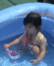 児童館で水遊びをしました。お友達はすっかり水に馴染んで楽しそう♪今日の王子はどうかな?プールをのぞき込んで興味津々!早速入れてあげたら大泣きされました。お友達は大きいプールも自分で出たり入ったりしようとしていましたね。 今日はママがお手伝いしてくれていたけど そのうち自分で出来ちゃいそうだね!暑かったせいか 何とプールに入ることができました! 良かったね! これも一緒に水遊びしてくれたお友達のおかげ♪ どうもありがとう! これからもマイペースでゆっくりいろいろな事にチャレンジしていこうね!プールの後はお昼を食べてお友達と遊びました。ピアノが上手なお友達ダンスが上手なお友達いつまでも食べている王子・・・今日も真夏日 熱中症にならないように 麦茶もたくさん飲みました。珍しくお帽子もかぶってくれました。今日の絵本☆もこもこもこ 作: 谷川 俊太郎 絵: 元永 定正 ☆くだもの なんだ