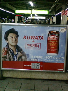 池袋駅にて。本当かどうか知らんけど温度計がついていて3℃だって。実際今日は雪が降っててマジ寒かった。