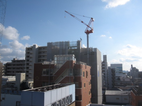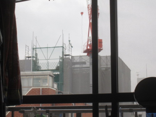 私の机から見た風景です。手前のオレンジ色の建物がうちと同じ7階建てマンション。向こうに建設中なのが13階建てマンション。その隣にも13階建てのマンションがあります。隣の高さと比べるともう少し高くなりそうです。13階建ての上の方だとエレベーターが止まった時にしんどそうです。
