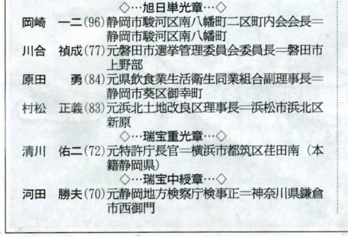 静岡新聞 2014/4/29 19面より旭日単光賞村松正義元浜北土地改良区理事長浜松市浜北区新原