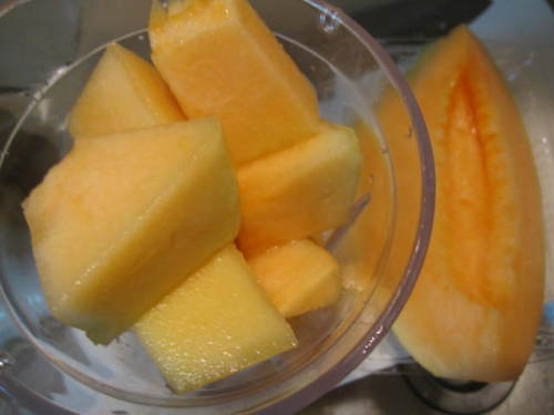 メロンの価格が少し上がってきました。1か月くらい前は1個400円だったのが最近は1個500円くらいになってます。高くなった分、スーパーではカットして売るようになりました。ジュースにするには1/4のカットくらいで十分です。