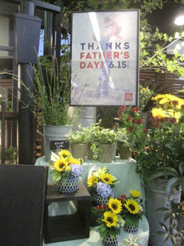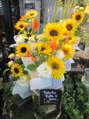 最近の花屋さん。5/11の母の日の次は6/15の父の日がイベントのようです。5月は紫陽花が並んでましたが最近はひまわりがメインになってます。