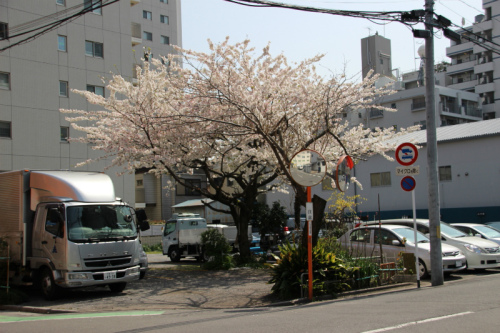 うちの近くの駐車場で毎年フライングで満開になる桜です。