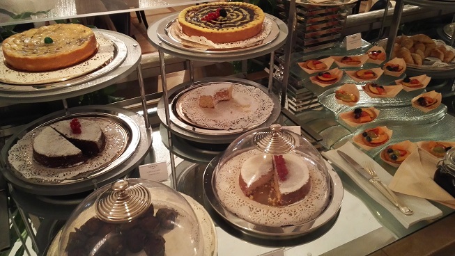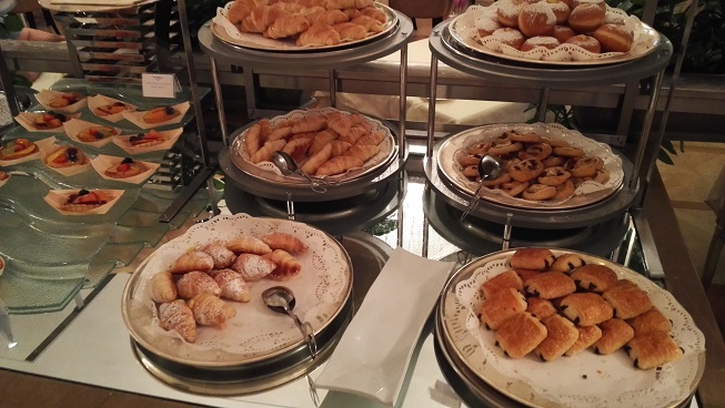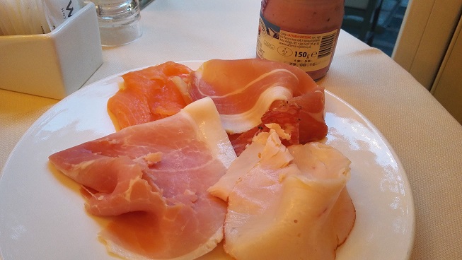イタリア初の食事なので、生ハムやチーズがあるのがうれしい。ハムやチーズ、パン、ケーキが何種類も!