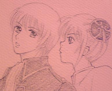 ぶっちゃけ、バストアップしか描けないロータスです!目指せ☆全身像!「・・・そのうち描けるよーになんだろ。」とか思っているうちは、絶対描けるようにはならない気がします。(゚д゚)、ペッ お絵描きは学生時代以来です。ま、その頃も落書き程度だったんですがね(゚∇^*) テヘ♪全身と男の人が描けませんでした...じゃ、何が描けてたんだよ!っと新ちゃん並みのヘ(..、ヘ)☆\(゚ロ゚ )が入りますね。女の子の顔しか描けませんでした。 久しぶりに描いてみて、あの頃と全然変わってなかったです...あらヤダ、まだまだ若いな~♪なんて、とぼけている場合ではありません。...そりゃそうです。高校生の時に解けなかった方程式が、今解けるはずがありませんもの。 そんな私が今年、新たなる挑戦です!(↑こう書くとなんだかカッコいいよね☆)うん、頑張ってみよう。出来るだけ。←すでに弱気 (--;) 色鉛筆で色塗りをするのも面倒になってきつつあり…今日も鉛筆絵です。 総悟クンと神楽ちゃんを描いてみました。 別にカップリング(沖神?)とかではありませんよ~。あしからず。私、銀魂に関しては、特にCPとかないです。キッパリ!笑) 最初に総悟クンを描いて、物足りなく感じたので神楽ちゃんを付け足しました♪大体、そんな感じ~ィ 神楽ちゃん、ドS王子のうなじの匂いを嗅ぐ。の図「お前、加齢臭がするアルな。パピィと同じネ!」「乳臭せーオメェに言われたかねぇやい。」 とか、言ってる感じでしょうか。(゚∀゚)アヒャヒャ