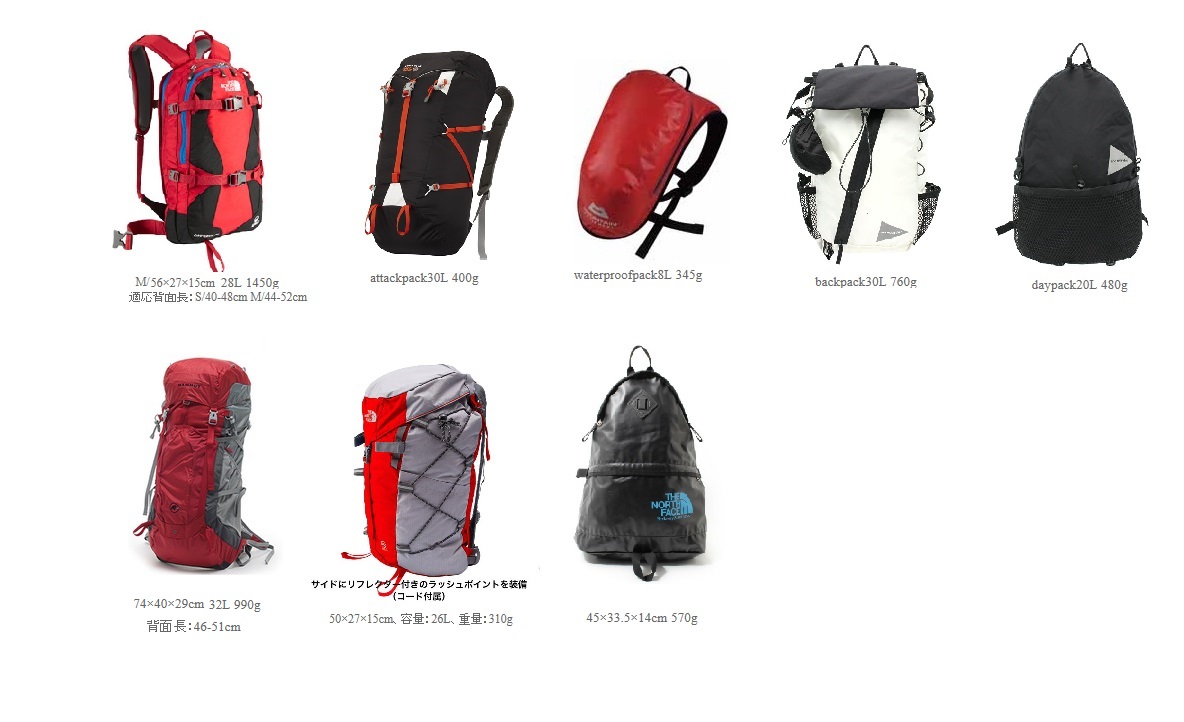 山で使う物は別として私(20L 600g、backpack30L 760g 、attackpack30L 400g)daypack20L 480g 、waterproofpack8L 345g相方(32L 990g、42L 1190g、50-75L ?g)45×33.5×14cm 570g30L 1390g ←相方が次狙っている物★2013年秋モデル 28L 1450g★★ポイント10倍★★送料無料★【ノースフェイス THE NORTH FACE】 チュガッチ CHUGACH 28 【10P...価格:18,360円(税込、送料込)●内部のジッパーで2気室になるパネル、背面オープン式●高強度のボンバスティックコーデュラナイロンファブリック●フロントは擦れに強い840Dナイロンで補強●大型のアバランチツールポケット●ポールストッパー兼用サイドコンプレッション●折りたたみ式のポールに対応できる右サイドポケット●雪が付きにくい成形の背面パネル●背面パネル裏にメッシュポケット●内部にキークリップつきメッシュポケットとハイドレーションスリーブ●左ショルダーにジッパー式のストレッチポケット●右ヒップベルトにジッパーポケット●左ヒップベルトにギアループと収納式ポケット●トップスタビライザー●ハイパロンで補強したエッジガード●STEEP SERIES素材:315Dボンバスティックコーデュラナイロン、840Dナイロン寸法:M/56×27×15cm 適応背面長:S/40-48cm M/44-52cm ★普通便で送料無料★THE NORTH FACE(ノースフェイス) Verto 26 ヴェルト 26 NM06102 KA(ブラック×アスファルトグレー)価格:8100円(税込、送料無料) (2017/1/24時点)【サイズ】寸法:50×27×15cm、容量:26L、重量:310g 不要な装備をデポしてピークハントに向かう際に重宝するアタックザック。またスリーピングバッグを収納するスタッフバッグとして兼用でき、雨蓋のコンプレッションバンドを用いて小さくすることもできますScrambler™ ULT 30THE NORTH FACE(ノースフェイス) VERTO 26 (ヴェルト26) センテニアR CR 素材:100Dカーゴシュートナイロン• サイズ:50x27x15cm•容量:26L•重量:310g•仕様:軽量で強度のあるカーゴシュートファブリック、 寝袋をコンパクトにする3点締めのコンプレッションシステム、 2つのツールループつき、 雨蓋にジッパーつきポケット、 本体内部に収納袋兼用のジッパーポケット、 サイドにはリフレクターつきのラッシュポイント(コードつき)、 取り外し式のウェストベルト風雨や雪による浸食に加え、大勢の登山者の足が山肌にやすりをかける。私たちは、だましだまし登山道の延命を図りながら、無理して登らせてもらっているのだという感が拭えない。