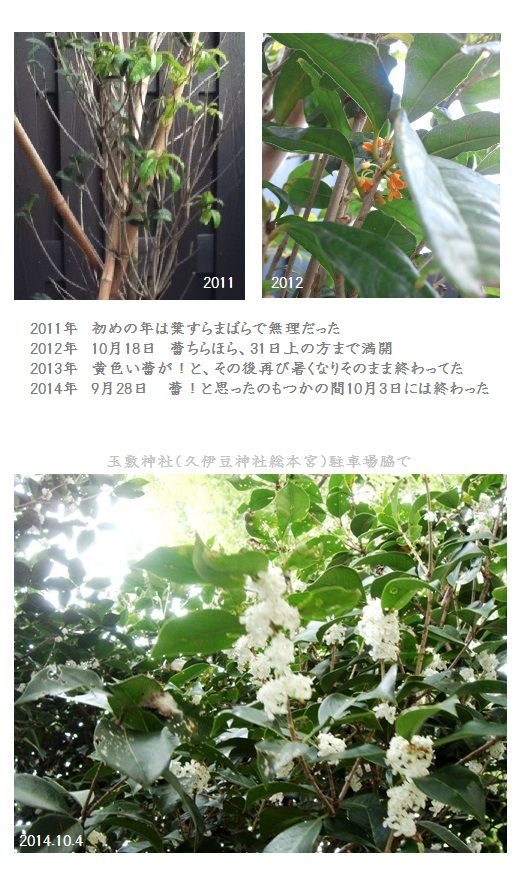 先週末、ポツポツと花を付けてることに気付き楽しみにしてましたが今日既に全部落ちていました。あの時が満開だった様子。桜の時と同じように記録として・・・2015年 9月27日 ~ 10月15日2016年 10月20日一斉に蕾を付け香り、翌日開き初め、更に翌日見事な満開!2017年 10月12日 冬場に肥料やり忘れで花と葉のつきが少なかった。2018年 肥料の効果を見たかったのに台風で咲始めを全てもってかれる。が再び蕾、で終了・・・