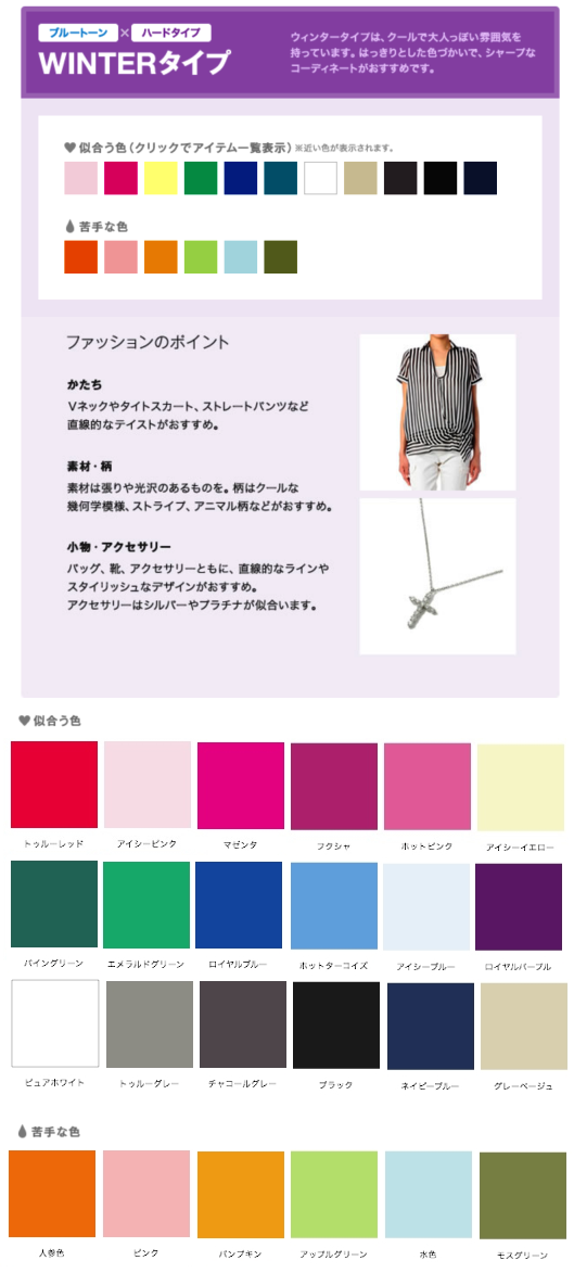 着回し、これ重要視してましたが難しい。ここぞという全身ワンコーデ決めてそれを何パターンか作っておく。そこからアイテム交換し「ここぞコーデ」が広がったら着回しなのかなってセンスを持ち合わせていない私が最近やっと気付いたことです。全体のバランス(着丈重要)と、あとは自分に似合う色。先日届いたメルマガ見てカラー診断やってみました。「青みがあり、とても濃いかとても薄い、鮮やかな」色が得意です。無彩色やクリスマスカラーを含み、クールで洗練された印象のカラー群です。いや~納得(⊙ω⊙)!!念のため他でやっても同じ結果、こっちの診断はWaveパーソナルデザインは診断がイマイチわからず。『フェミニン、ロマンス、キュートタイプの可能性』とわかっただけでも良しとします。いくら一目惚れしても、人気のある品であっても自分に似合わなければ着ないもの。ボーダーライン(自分体型の許容規格)定めておけば否応なく判断下り、例えそれがどんなに欲しかった物だとしてもすんなり諦めつくんだな。・・・悔し涙は流すけど・゚・(つД`)・゚・+++++++++++++++++++++++++++++++今日アウターで買おうか悩む物がでてきてしまい:;(∩´﹏`∩);: 6月に下書きしたままだった記事ですが、判断するため再診断して完成させました。私、グレー大丈夫そう。キヨミズから飛び降りちゃおう・・か・・な?