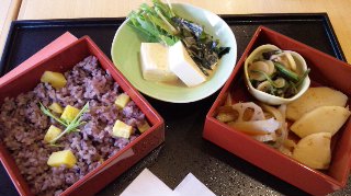 黒米と薩摩芋のごはんと筍にれんこんと人参のきんぴら、わらびやぜんまい等の山菜、体にやさしく美味しい(o^~^o)この後のデザートも素敵!