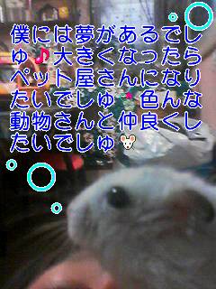 今日、ハッチと遊んでいたら何か静かにしてたので何か思ってるのかというと・・・ そっそんなリアルな夢見てたんだ・・・(こっちもびっくり)でも偉い事なのかもねなれない可能性高いけど頑張れ あっなっ何でこっちを見てるんでしゅかびっくりするでしゅよ(ん・・・もっもしや、夢がバレたんでしゅか)まぁ、飼い主さんだけならいいでしゅ この夢は日本中に知れ渡るかもしれないよ ハッチを応援してくれる人はポチッ