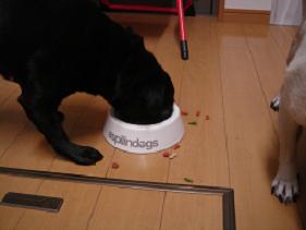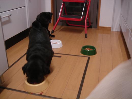 いつもゴハンを食べるとき、す~ちゃん けっこうゴハンを散らかすんです どうしてでしょうね? でも大丈夫ちゃ~んとお掃除係りがいるんです! おこぼれいただきます! す~ちゃんにうなられて、カメラマンの横で待機する ほとちゃんです ハアハア激しい息づかいも。。。ほとちゃんです