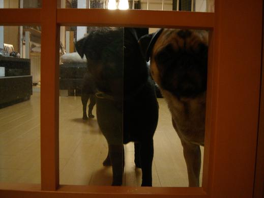 タタミコーナーでヨガをしていると・・・ 気になるのかみんなで見にきました タタミコーナーは入っちゃダメな場所。みんなは入りませんよ~。 一応入れない様にクリアボード立て掛けてあるんです。 待ちくたびれた3パグ。 なぜがタテ一列。この順番て何か意味あるの??? だいたいヨガ15分くらいしてるんで・・・ 待ちきれなくなった鈴でした。