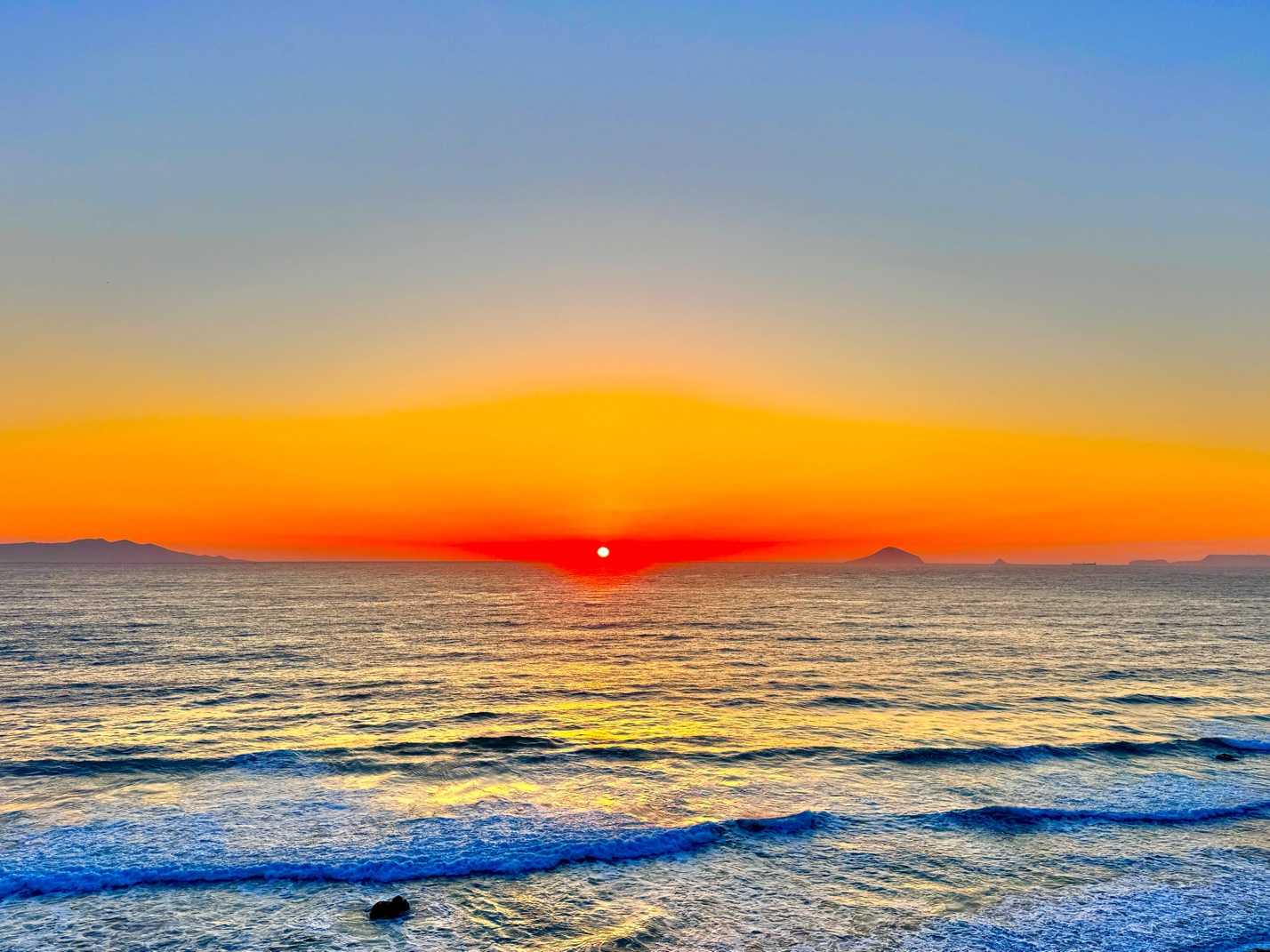 真っ赤な太陽が海面に黄金の道を描き出す——