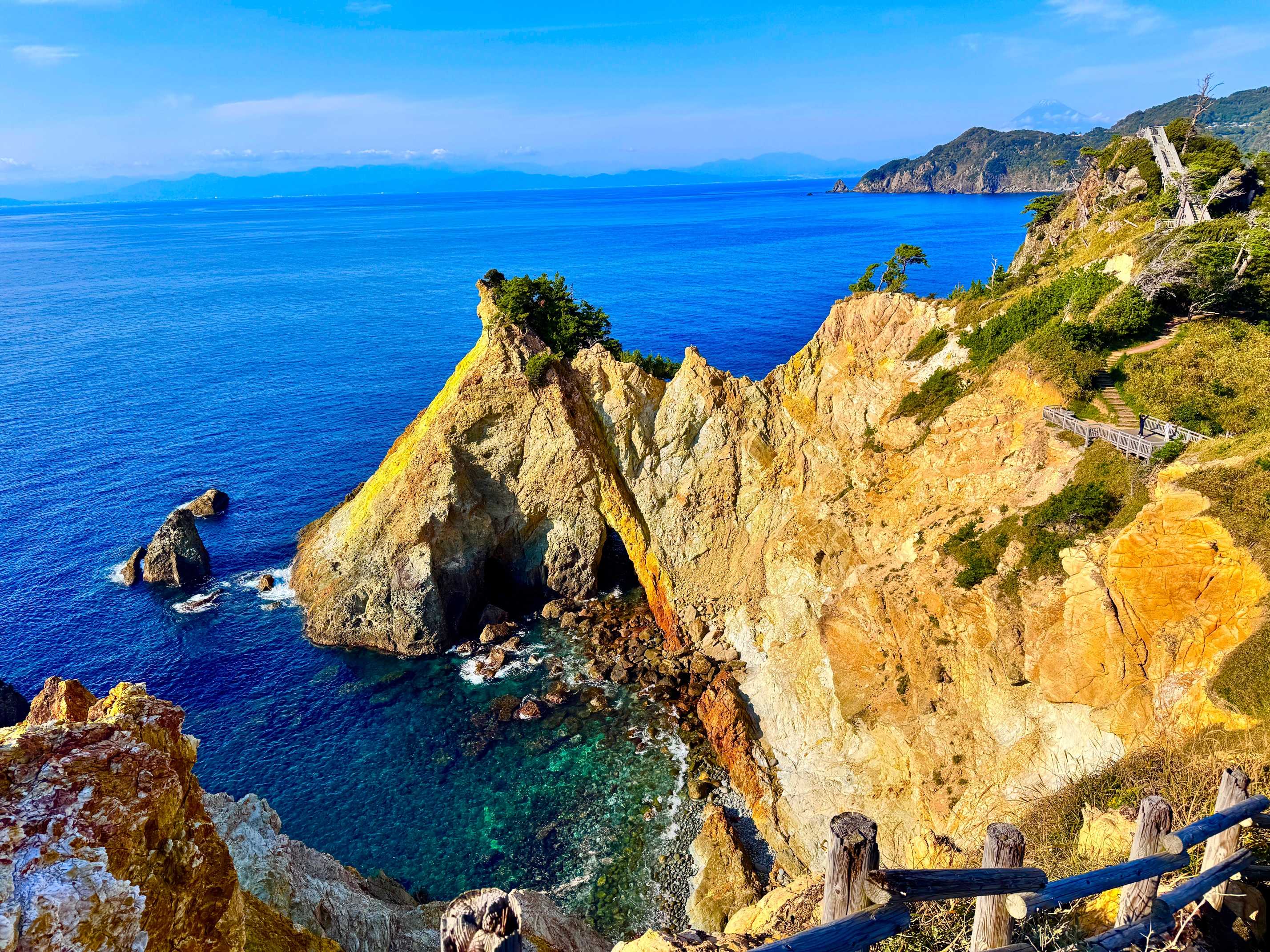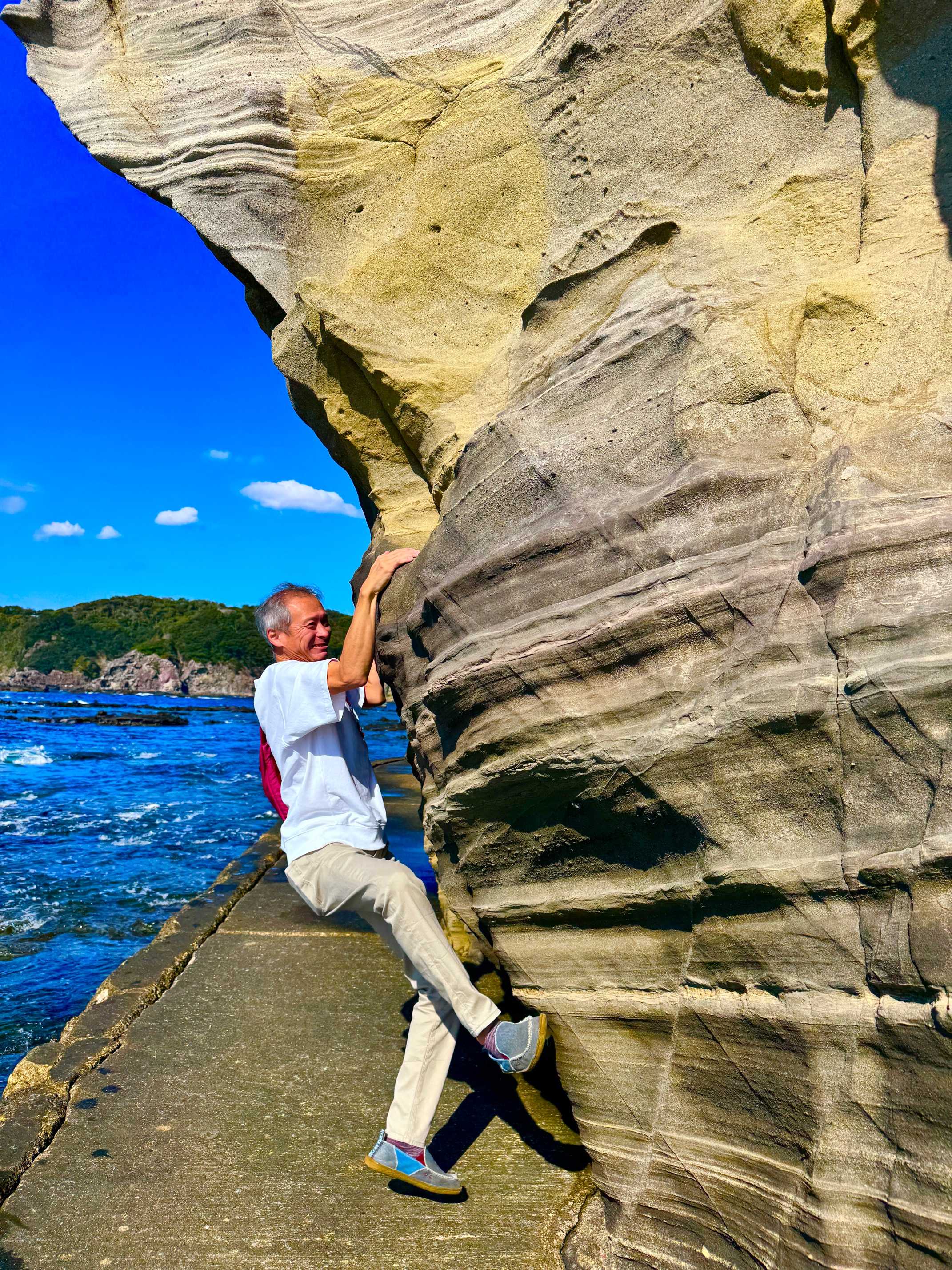 圧巻の岩壁と青すぎる海…。
