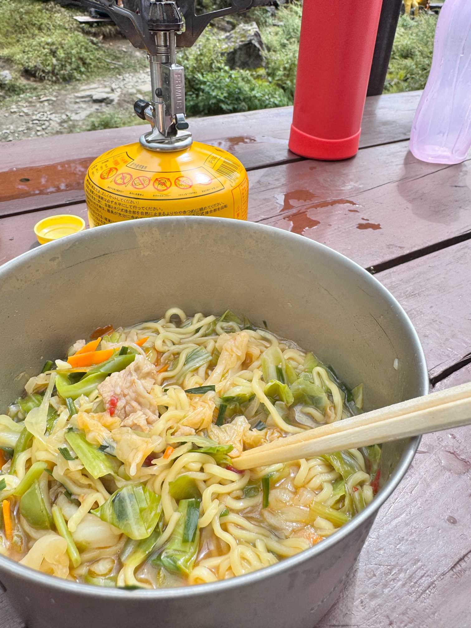 肉と野菜をたっぷり詰め込んで冷凍し、さらに1リットルの熱湯やガス&コッヘルを担いでいました。