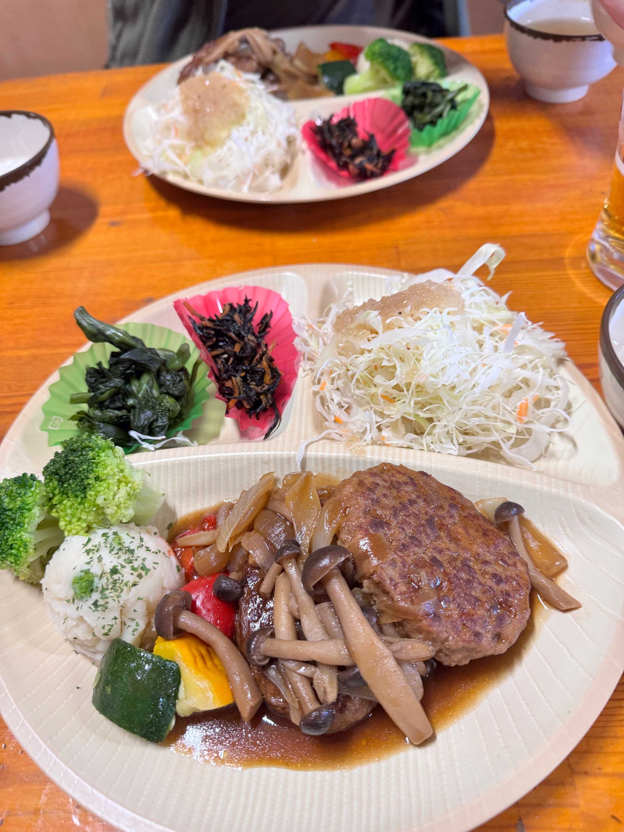 お楽しみの夕食はなんとハンバーグ2つにきのこソース、キャベツ山盛り、小松菜の煮浸し。ひじきの煮物、杏仁豆腐