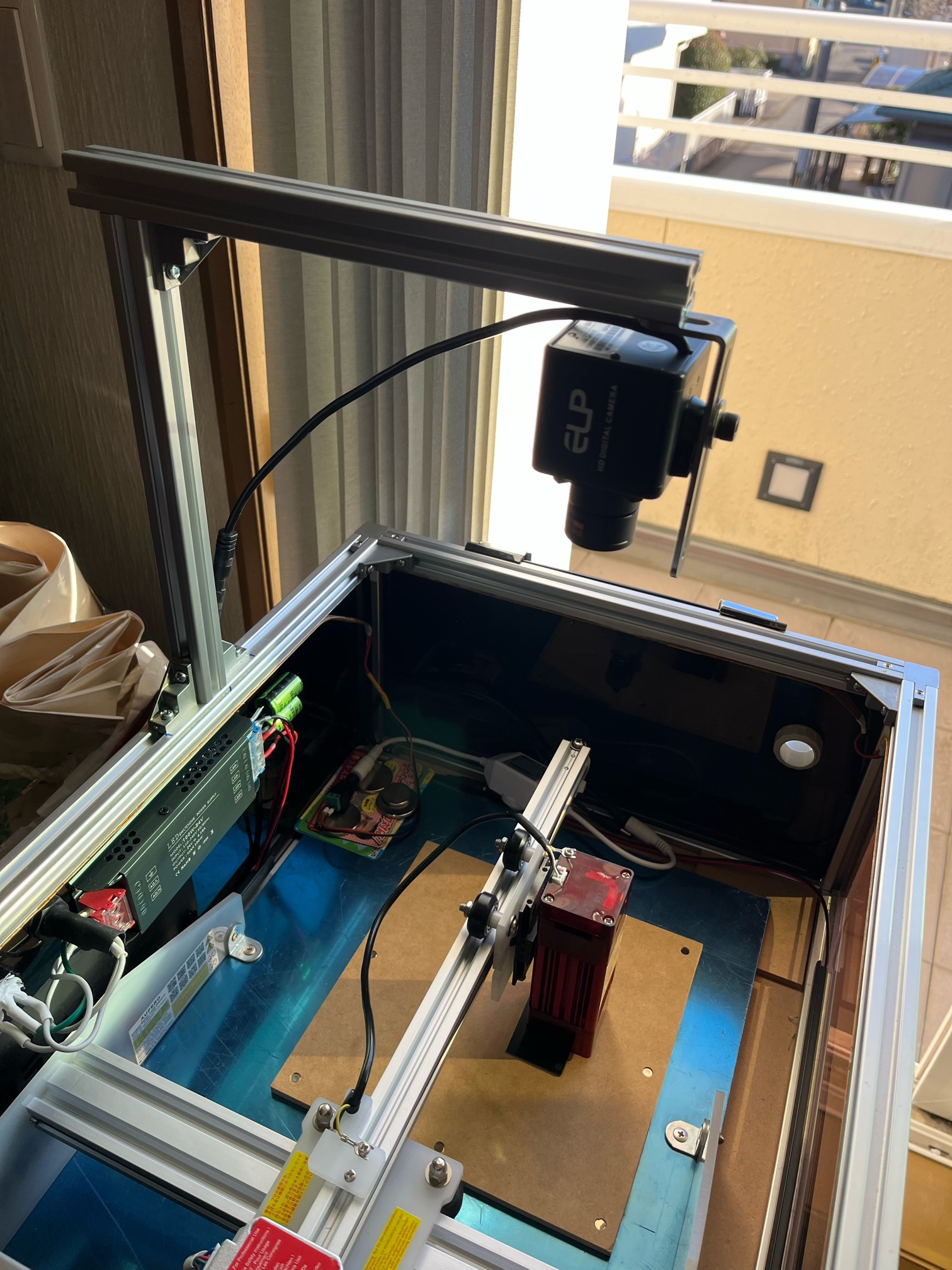 カメラの固定台は、ケースのフレームと同じ、2020アルミフレームを使いました。格段に剛性アップしてカメラが安定しています。