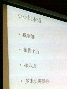 今回の研修で最も笑ったのは、「当て字で覚える日本語講座」です。私が日本人なので、主催者たちは色々と気を使ってくれていました。福州でも、この年末や春節に日本へ観光を予定している人たちが多数いました。そこで、中国人講師の方が、自分の体験を話してました。その中で、やはり言葉が通じないと不便だし、少しでも話せば興味を持ってもらえる、、、ということで、↓こんな言葉で日本語を教えてました。これは漢字の意味としては全く違うのだけど、発音が近いから、ということで、当て字で日本語を覚えるのだそうです。ちなみに、上から、「うぉはよう」「こんにぃちーわん」「こんぱーわん」「どぅおもしみましぇ」、、、と、何やらそれなりに日本語に近いようです(笑)。それ以来、休憩中にすれ違う人々が、「どぅおもしみましぇ」とか言ってくるわけです(笑)。中国人観光客たちの日本での苦労から、次に行く人たちへのアドバイスが行われていました。ちなみに、福州の人々の人気も圧倒的に「北海道」でした。90%が手をあげています。昨年、放映された映画の影響が大きい上に、元々70年代から、高倉健の人気が絶大なため、高倉健=北海道、、、のイメージが人気の下地にあるようです。