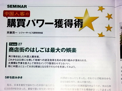 週刊トラベルジャーナル6月20日号に連載中今週号は↓どの路線でも問題視されている駅前商店街をコンテンツとして外国人観光客に楽しんでもらう方法を掲載しました。知人の中国人観光客を実際に連れて行って実験してみました(笑)。観光産業の良い所は、無駄に巨額の投資が必要ないことです。よって税金を無駄遣いする率が低い。(空港も港も駅も余るほどあるので…:笑)逆に今あるモノをどう活かすか?の勝負です。===いつも思うのは、観光産業は難しい、ということ。自分たちにとっては当たり前のことの中に外国人が喜ぶモノがあるからです。これは実は国内観光も同じで、たいていは自分の県や市の良い所は自分ではわかんないものです。来てもらう客は、県外、国外の人だからです。「お客様の立場」になりづらい。だから「自力ではできない」産業と言えます。自分たちの長所短所を他県や外国人に指摘してもらいながら邁進していくしかないわけです。そういう意味ではそれに耐えられる所は伸びるだろうし、そうでない所は衰退する…そういう業界です。中国人観光客にもっと売る新“おもてなし術”価格:1,470円(税込、送料別)