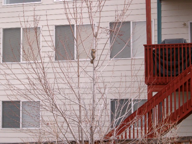 あれっ~~~~よ~く見ると、りすここら辺でリスは珍しくないけれどよ~く見ると必死に枝にしがみついていますどうやら、うちの裏の家の大きな犬が2匹すっごい勢いで吠えていますかわいそうな、りすくん静止状態で、そのまま1時間びくとも動きませんでした春ですねデンバーも今日は20度越えました