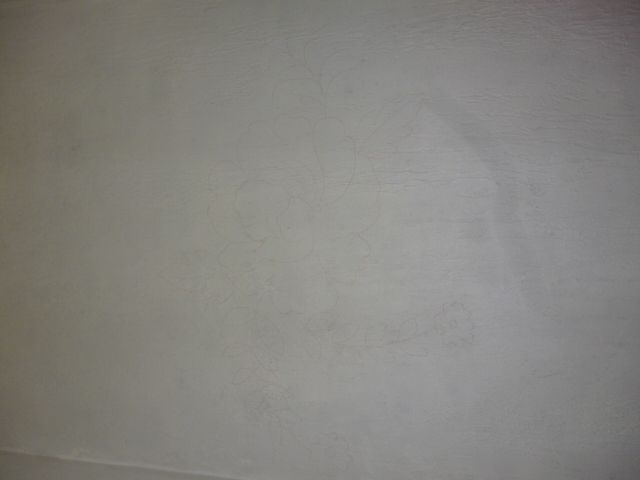 先日 晴れた日に お風呂場のペンキを塗り替えました指を白いペンキで汚しながら(髪の毛にも少し付いちゃったり)結構好きな仕事です。まっ白になった壁に 何か絵を描きたくて・・・・・考えること1週間今日は 朝から作業開始です。鉛筆で だいたいの線を書いて (見えにくい) 横80Cm 縦60Cmあるので 結構大きいです100円Shopのペンキは 助かりますね お絵かきは 楽しいですニャン