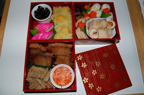 明けましておめでとうございます。今年はバージニアに引っ越して来て初めてのお正月、ちょっと実家に帰ればいつでもおせちが・・・って訳にも行かなくなってしまったので、今年は張り切って自分でちゃんと作ってみる事にしました。とは言えここでは手に入る食材も限られているし、かと言って日系ストアで高い日本食材を買うのは私のポリシーに反するので(というか家計の問題で)割と簡単に手に入る材料でできる範囲の手作りをしました。おせち!一の重・・・・・黒豆、かまぼこ、芋栗きんとん二の重・・・・・紅白なます、たたきごぼう、ソードフィッシュの照り焼き三の重・・・・・煮物(里芋・人参・ハス・椎茸・ごぼう・絹さや)、鳥の野菜巻き蒸し 結構おせちっぽいよね?大体こんな感じだよね?黒豆はちょっと前に日本に里帰りしていたお友達に買ってきて貰った豆を煮ました。きんとんの栗は、GUAMに住んでた頃栗の甘露煮がどうしても手に入らず芋きんとんになってしまった事があったので、それだけはこっちに引っ越して来る時に消費期限の持つやつを買って来ておいたの。クチナシが無くて色はイマイチだけど味はいいです。煮物も今年はちゃんと全部別々に煮たよ。ところでソードフィッシュってやつは日本語で言うと何になるんだろ?食べた感じは鰤(ブリ)っぽくて私は好きなので照り焼きにしてみたんだけど。知ってる方いたら教えてください。お雑煮も作ったよ。私は関東の人なのでお醤油味です。鶏肉を入れました。大晦日からいつもの友達が来てくれてみんなでカウントダウンをしてワインで乾杯、年明けから楽しかったので今年(こそ)はいい年になりそうな予感がします。みんなはどんなお正月を迎えてますか?今年もよろしくお願いします!