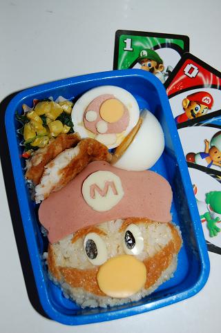 何だか久しぶりのお弁当UPな気がしますが。ちゃんと作ってましたよ。ここ1週間旦那の車が壊れていて日中は足が無いので家に閉じこもっています。試しに次男と近所のダラーショップまで散歩がてら歩いてみたらあまりの寒さに息子が泣きはいってしまったのでセールになっていたニットキャップと手袋のセット(バットマン柄)を買う羽目に。私も寒さでちょっと具合が悪くなってしまったのでもう無茶はするまい、と誓いました。マリオ弁当先週のヨッシーに引き続きスーパーマリオシリーズで行ってます。最近はグラフィックがスゴ過ぎてお弁当にするのもなかなか大変。ゆで玉子がさりげなく(さりげなくない?)キノコになってます。キノッP弁当これちょっと可愛くていいんじゃないかなーなんて自分で思ったりしました。前日に鶏のドラムスティックを和風に煮たので骨を外して入れました。ニットなサンド朝息子に「これ何だ?」と聞いたら「セーター!」ってすぐ分かってくれたんだけど学校のお友達は何故か“スポンジボブとパトリック"だと思っていたらしいです。よくよく見ると、あーなるほどねー。子供の感性って面白い。この週末、金・土と旦那の友達が泊まりに来ています。一応お客さんなのでそれなりの物を作って食べさせなきゃーとか思うとちょっと大変。週末くらい手抜きしたいのになあ・・・。でも彼はGUAMにいたころ一緒に仕事をしていた子なので(今は違うベースに居ます)来てくれると何だか懐かしくて嬉しい。彼は「GUAMが恋しい~!」とよく言っているんだけど、私も冬場は本当そう思うわ~!(笑)