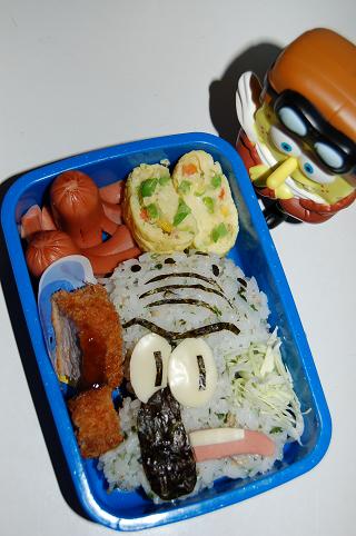 凹凹期間から復活しました!今日は元気です!早速行きます。スクイッドワード弁当スポンジボブに出て来る意地悪だけどちょっと憎めないおじさん(?)です。スポンジボブキャラもこれで5人目、次は誰にしようかな~?スター弁当見たら分かると思いますが手抜きです。と言うか何も思いつかなくて・・・。黄色いご飯はカレー粉とシーズニングソルトです。星条旗弁当星3つしかないけど・・・。日本の国旗も並べて日米友好弁当にしようかとも思ったんだけど、何だか風刺っぽくなりそうなのでやめました。そんな社会派じゃないし。っつーか日本の国旗って・・・『日の丸弁当』じゃ~ん!うちの長男は朝が弱く朝ごはんをなかなか食べてくれません。小さい頃からちゃんと朝・昼・晩と1日3食食べさせてきているのになぜだろう?起き抜けは食欲が無いだろうと思ってちょっと早めに起こしてジュースを飲ませて支度をさせながら時間をおいているんだけどダメです。調子の悪いときは吐いたりします。何かいい方法ありませんかね?