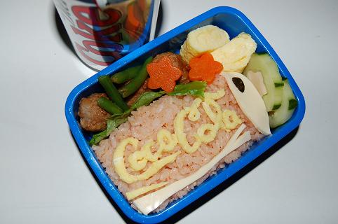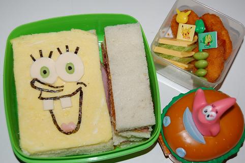 9月から長男、1年生になりました~!で、ようやくお弁当の方も再開!しかーし!新しいクラス、新しいお友達なのであまり始めっから大胆な事は出来ないのよ。何しろ周りの子供達のほとんどが日本食はもちろん、米のめしすらほとんど馴染みの無い子ばっかりでしょうからね。うっかりいきなり海苔を巻いたおにぎりなんて持たせようもんなら「わ゛~寿司だ~!気持ち悪い!」とか何とか言われてしまう事は必至。息子の偏食を気長にに改善してきたように、アメリカンキッズ達も徐々に洗脳していかなくては。と言う訳で、初日はサンドイッチにしました。スポンジボブサンドクラスメイト達はかなりビックリしてたみたい。そりゃーそうだよね。でもみんな羨ましがってたとお兄ちゃんはご満悦!スマイル弁当試しにご飯を持たせてみた。でも海苔は少なく、キャラも強烈じゃないようにスマイル君あたりで。おかずがしょぼい?時間無かったんだもーん、ほっとけ!お弁当を持って行かない子供はカフェテリア(いわゆる食堂)でご飯を買います。1食$1.75と結構お安いので週に2回位はいいかな。お弁当作りは週3ペースでやってくよー。お弁当TOPページへ