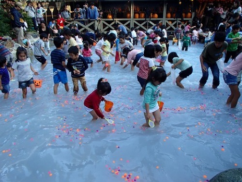 恒例 じゃぶじゃぶ池のスーパーボールすくい。。今年はバスクリンで乳白色の池に・・・・・屋根の上から大量のスーパーボールが落ちてきます。。。今回もchumのお得意「お友達作り!」仲良くなったのは 同い年のfuuちゃん 初日から3日間朝から暗くなるまでず~っと一緒に遊んでました。。「ご飯食べたらブランコで集合ね~~~~!!」なんて、お約束しちゃったりなんかしてほほえましい限りですトリックオアトリートに向けてお菓子を用意やってまいりましたゾロゾロと・・・・この日の子供の数 約240人サリーは私です子供もさながら大人の仮装もこってる~~メイクうますぎ。。。こわっっサイトデコレーションもこってますお隣さんに写真撮らせていただきました。。。2週間ほどで作ったそうです。。。カエル君部門もすごいよ~~~我が家のカエル君 「夏さ~~~~~」着ぐるみも雲も雪も100均フェルトで手作りさ子供たち袋いっぱいにお菓子をもらってきて大喜び。。一年分くらいあるんじゃん